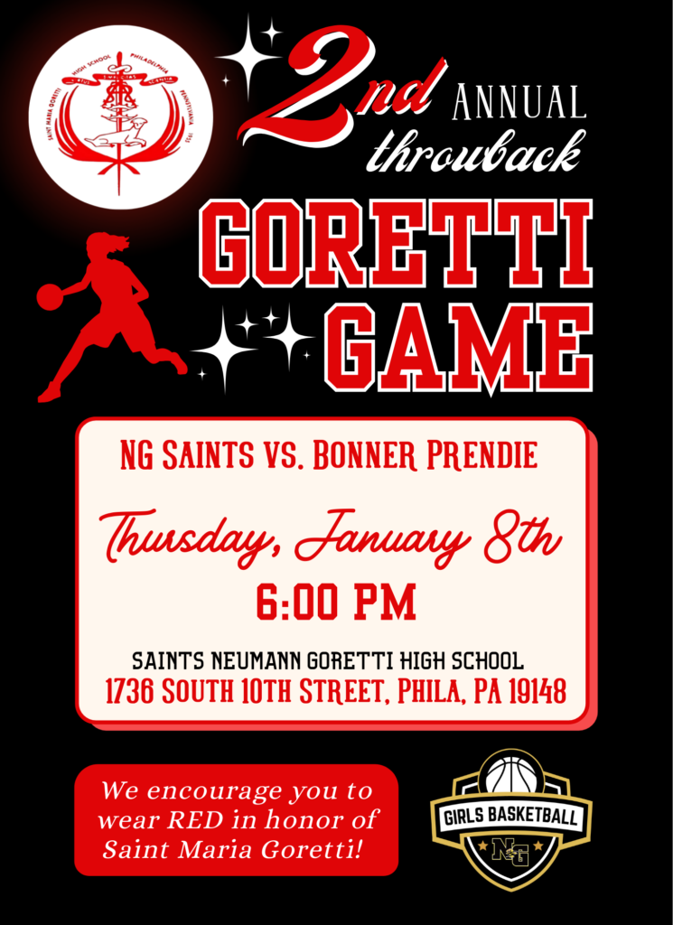 Please join us for our Girls Basketball Throwback Game! Join us for our PCL & State Champions Home Opener on January 8th and make sure you wear RED in honor of Saint Maria Goretti!